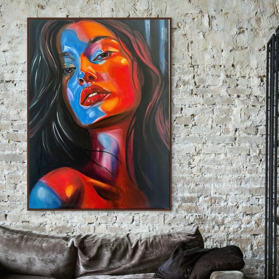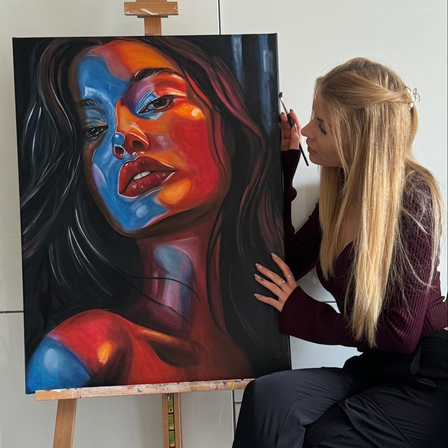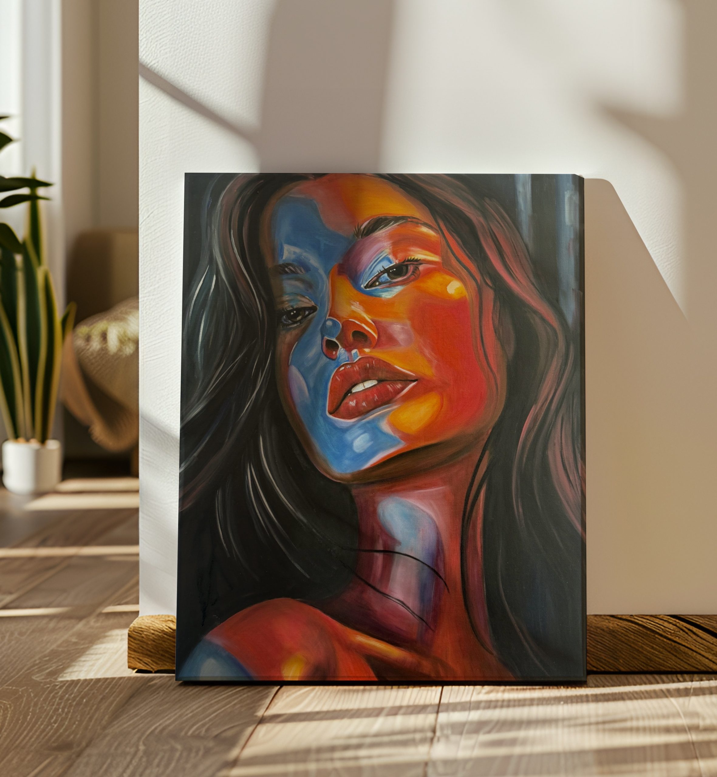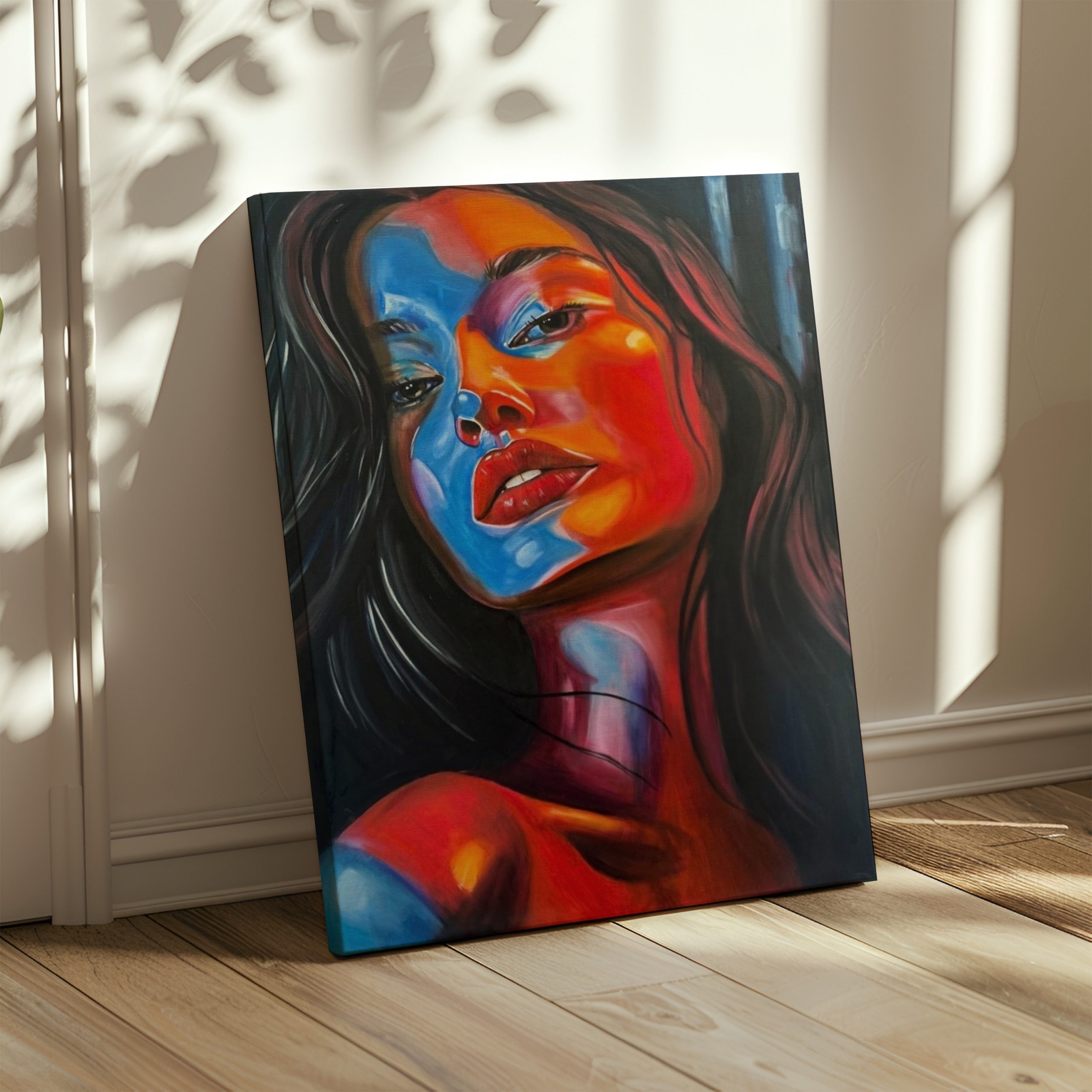 This painting shows a powerful mix of bold colors and deep emotion. The bright reds and cool blues highlight passion, strength, and the stories hidden in a single glance.